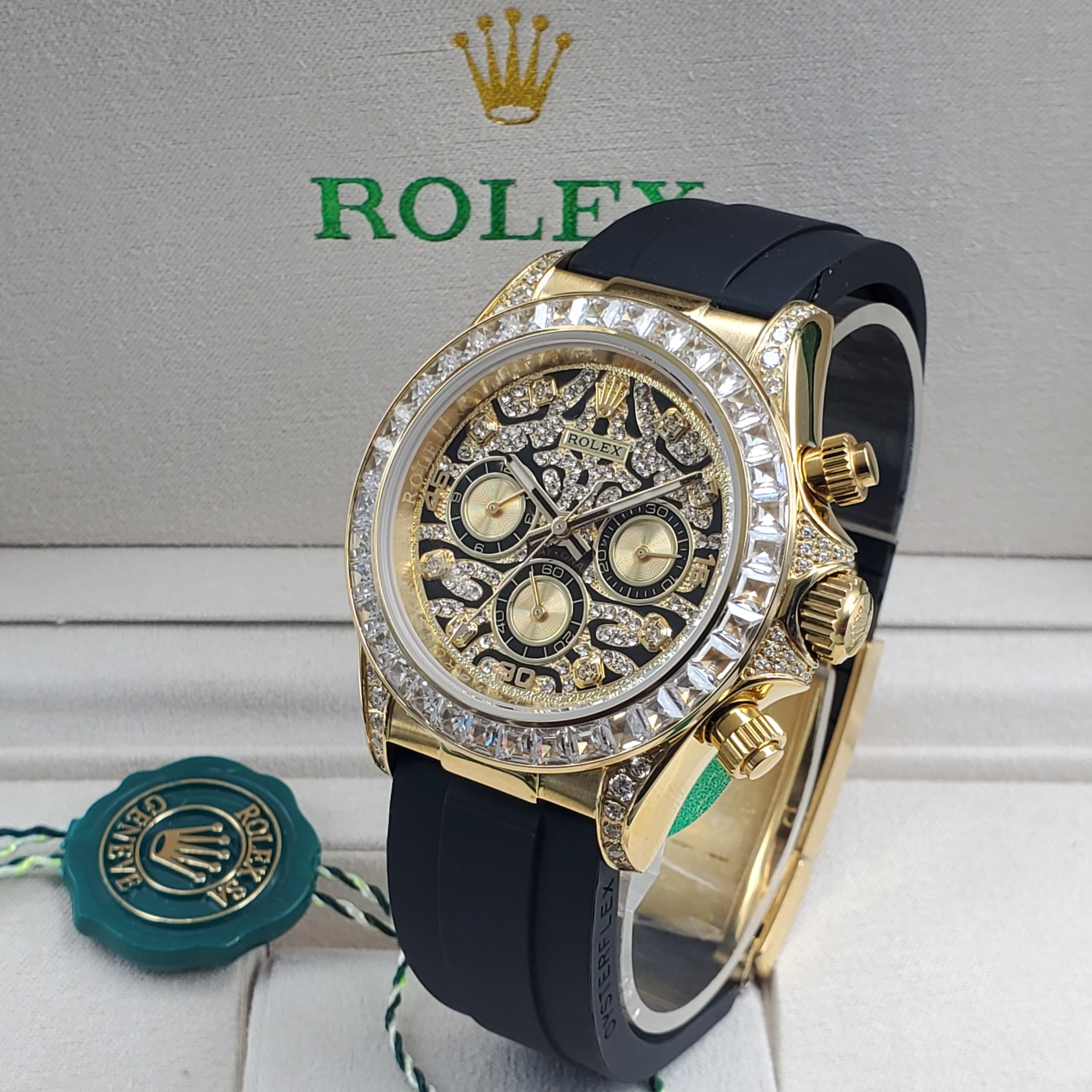 Turn heads with the Rolex Daytona Luxury Gold Diamond Chronograph, a perfect blend of elegance and performance. Designed for those who value prestige, this timepiece features: